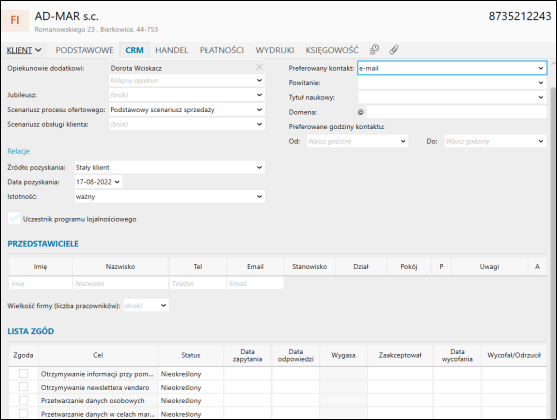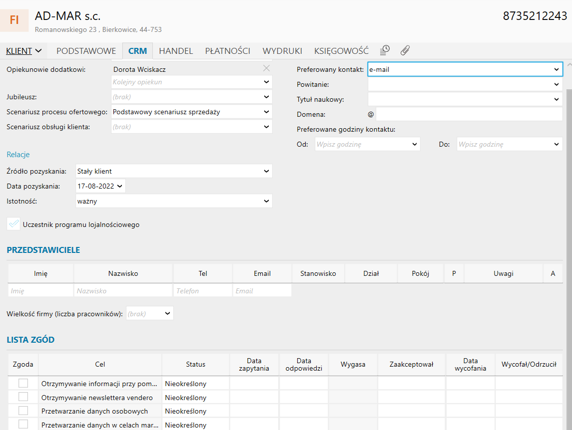 Zakładka CRM – Głównym elementem wykorzystywanym w tej branży będzie Opiekun podstawowy, którym będzie pracownik firmy, do którego klient planuje wizyty. Ważnym elementem jest również Lista zgód, które klient powinien wyrazić.