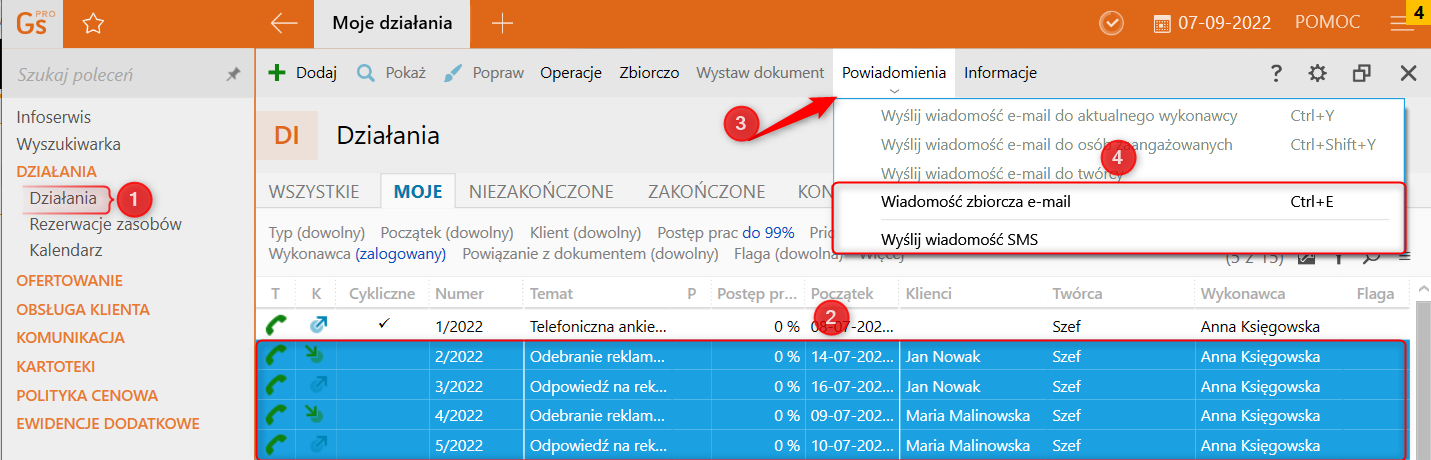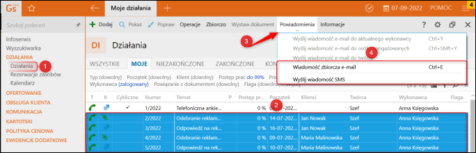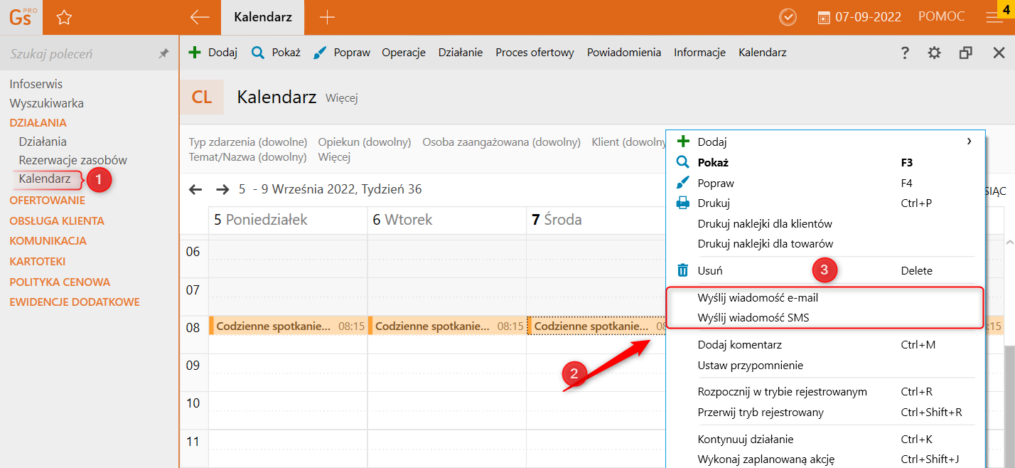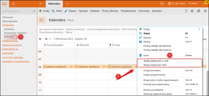 Wiadomość dotyczącą wizyty można przesłać z kalendarza, wybierając zadanie prawym przyciskiem myszy, następnie korzystając z Operacje ​ Wyślij wiadomość e-mail/SMS. Istnieje również opcja wysłania wiadomości zbiorczo do wielu klientów, zaznaczając zadania z użyciem przycisku CTRL przed wywołaniem menu kontekstowego prawym przyciskiem myszy.
