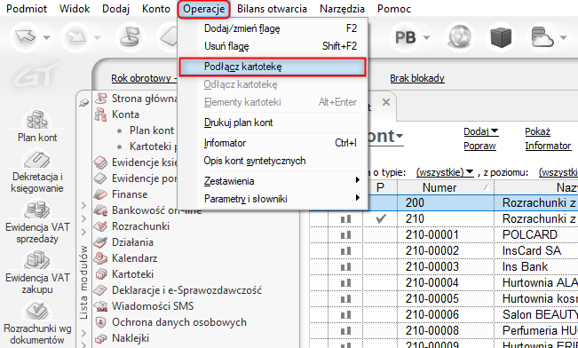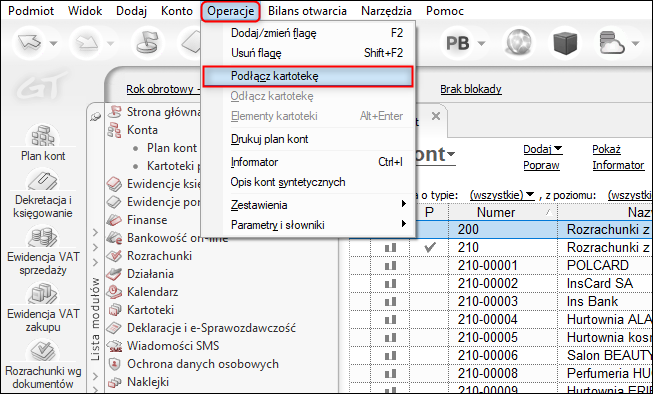2. W głównym menu programu Operacje wybrać opcję Podłącz kartotekę.