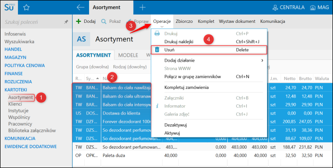 1. Przejść do modułu Asortyment, zaznaczyć wybrane towary, następnie kliknąć górne menu Operacje – Usuń.