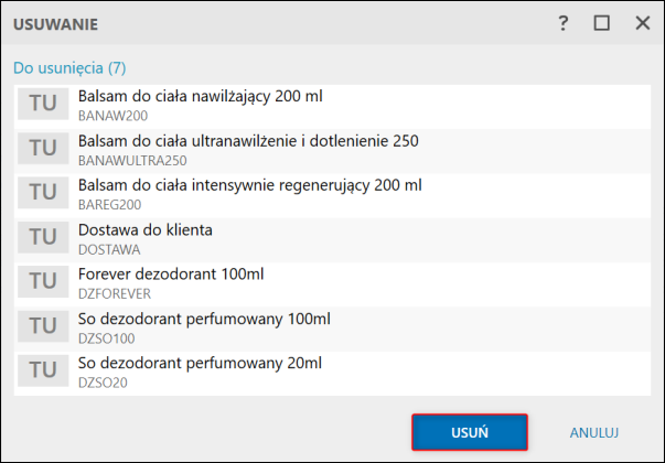 UWAGA!! Należy pamiętać, że będzie można usunąć tylko kartoteki towarów, które nie były użyte na żadnym dokumencie.