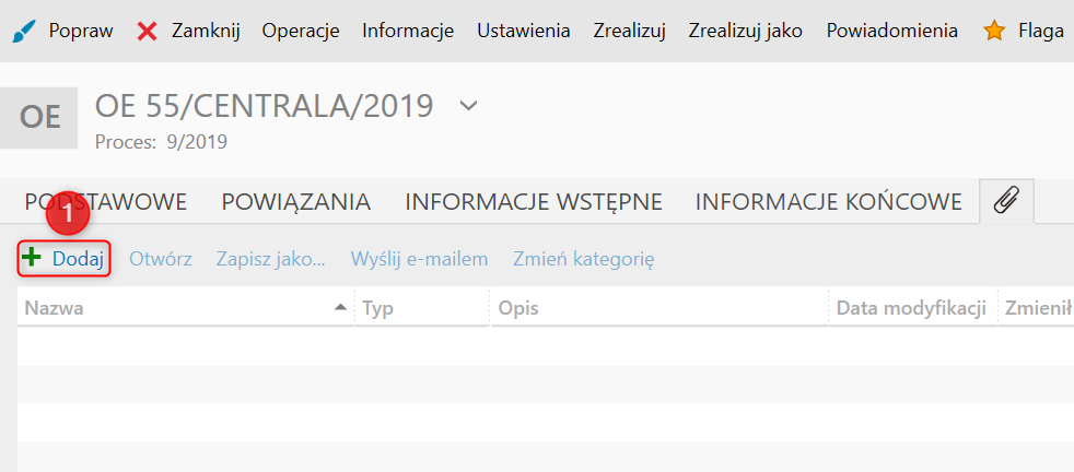2. Kliknąć przycisk Dodaj, wybrać z dysku plik, który ma zostać dołączony do oferty i zatwierdzić przyciskiem Zapisz.
