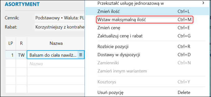W celu wprowadzenia maksymalnej ilości towaru na dokument, gdy towar znajduje się już w tabeli asortymentu (został wprowadzony ręcznie, czytnikiem, w ilości mniejszej, niż oczekiwana), można wybrać go prawym przyciskiem myszy, a następnie użyć opcji Wprowadź maksymalną ilość (skrót klawiszowy CTRL+M).
