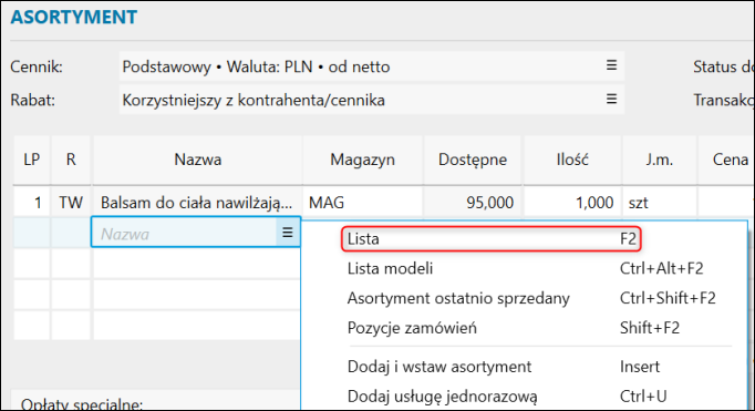 1. W trakcie edycji dokumentu otworzyć listę asortymentu.