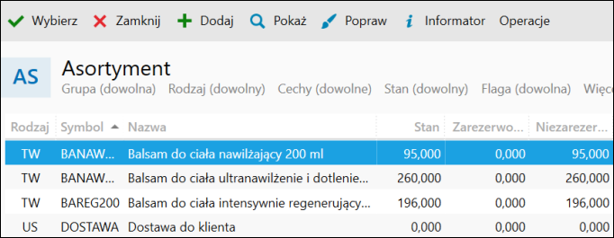 2. Zaznaczyć asortyment i kliknąć Wybierz.