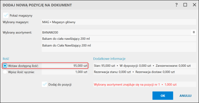 3. Wybrać opcję Wstaw dostępną ilość i zatwierdzić OK.