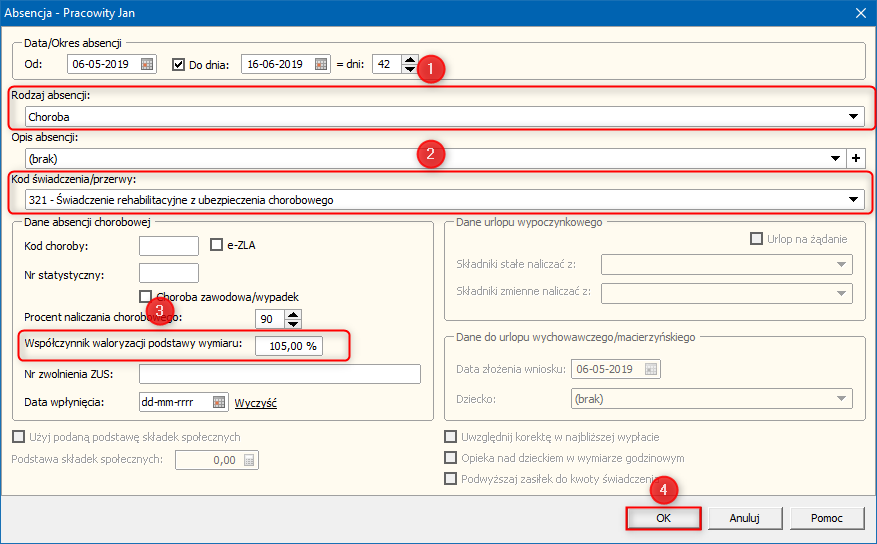 2. W oknie, które się wyświetli, należy wprowadzić rodzaj absencji jako choroba, a Kod świadczenia/przerwy powinien zostać wybrany 321 - Świadczenie rehabilitacyjne z ubezpieczenia chorobowego lub 322 - Świadczenie rehabilitacyjne z ubezpieczenia wypadkowego. Po wybraniu odpowiedniego kodu przerwy uaktywni się opcja Współczynnik waloryzacji podstawy wymiaru, w sekcji Dane absencji chorobowej, w której należy wprowadzić odpowiednią wartość. Absencję zapisać przyciskiem OK.