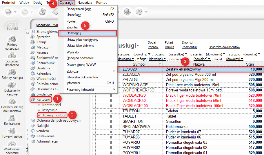 1. Z listy modułów wybrać Kartoteki – Towary i usługi, zaznaczyć komplet, który będzie rozmontowany i z górnego menu programu wybrać Operacje – Rozmontuj.