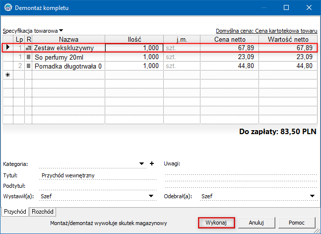 2. W oknie Demontaż kompletu w wierszu z kompletem należy wprowadzić ilość, jaka ma zostać zdjęta ze stanu magazynowego oraz po jakiej cenie. Wciśnięcie przycisku Wykonaj spowoduje stworzenie dokumentu RW na komplet oraz PW na jego składniki.