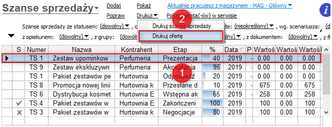 2. Zaznaczyć wybraną szansę sprzedaży i z górnej sekcji wybrać Drukuj – Drukuj ofertę.