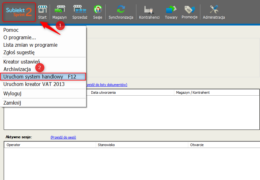1. W module Zarządzanie kliknąć logo programu w lewym górnym rogu i wybrać opcję Uruchom system handlowy.