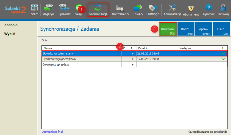 3. Po wprowadzeniu użytkownika w systemie handlowym należy w module Zarządzenie programu Subiekt Sprint, z górnego menu wybrać Synchronizacja, na liście zaznaczyć słowniki, kartoteki, stany i kliknąć przycisk Uruchom.