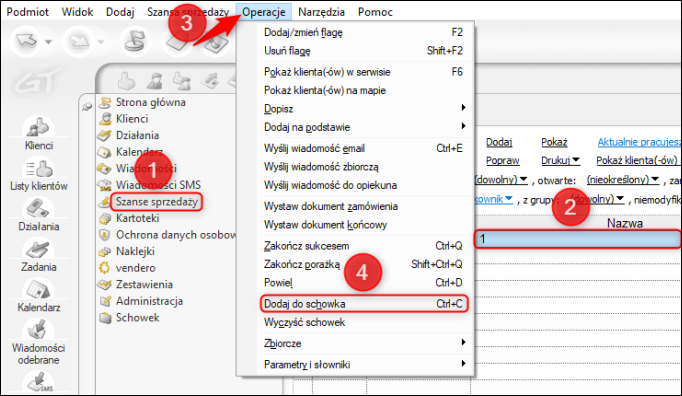 Aby skopiować szansę sprzedaży do schowka, należy odszukać i otworzyć moduł Szanse sprzedaży (na liście modułów lub w górnym menu Widok – Szanse sprzedaży), zaznaczyć wybraną szansę sprzedaży, a następnie z górnego menu wybrać Operacje – Dodaj do schowka.