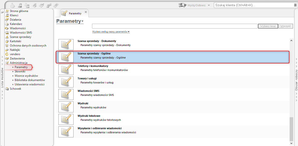 1. Przejść do modułu Administracja – Parametry i otworzyć Szansa sprzedaży – Ogólne.