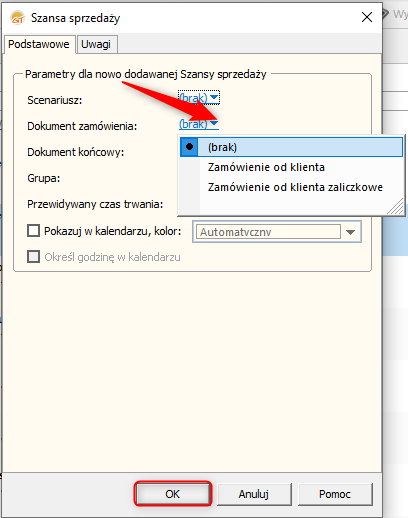 2. Rozwinąć sekcję Dokument zamówienia i wskazać domyślny dokument tworzony na podstawie szans sprzedaży, a następnie zatwierdzić OK.