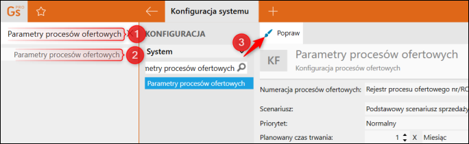 1. W lewym, górnym rogu programu, w wyszukiwarce wpisać Parametry procesów ofertowych, wejść w wyszukany moduł i kliknąć górne menu Popraw.