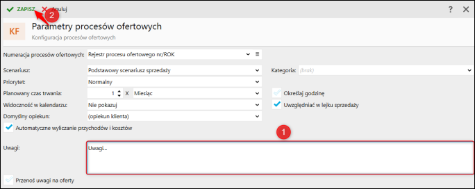 2. Wpisać Uwagi, które automatycznie będą pojawiały się na nowo tworzonych dokumentach procesów ofertowych i zatwierdzić wybór przyciskiem Zapisz.
