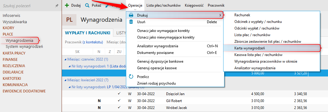 1. Przejść do modułu Płace – Wynagrodzenia na zakładkę Wypłaty i Rachunki, a następnie z górnego menu wybrać Operacje – Drukuj – Karta wynagrodzeń.