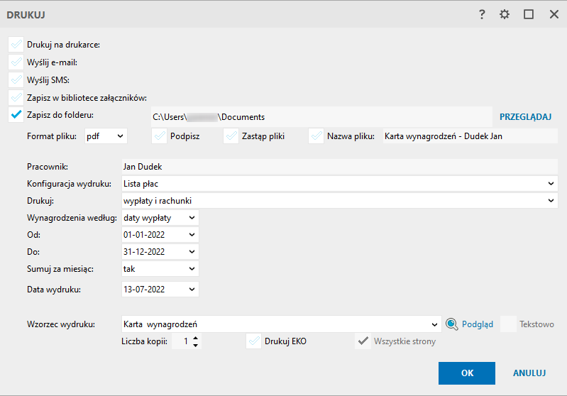 2. W oknie wydruku użytkownik może sparametryzować konfigurację wydruku, czy program wydrukuje wypłaty i/lub rachunki, sposób sortowania wynagrodzeń, zakres dat i sumowanie wynagrodzeń w miesiącu. Po wybraniu odpowiednich parametrów zatwierdzić przyciskiem OK.