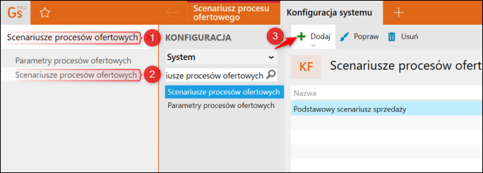 1. W lewym, górnym rogu programu, w wyszukiwarce wpisać Scenariusze procesów ofertowych, wejść w wyszukany moduł i kliknąć górne menu Dodaj.