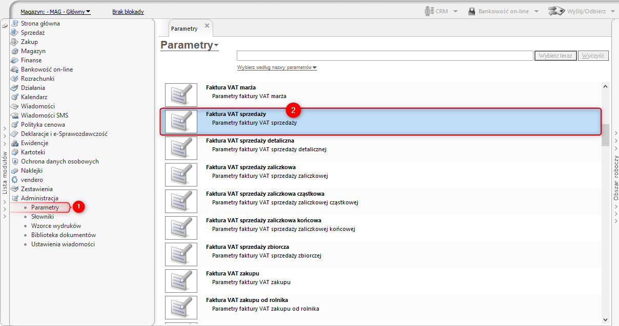 1. Przejść do modułu Administracja – Parametry i otworzyć Faktura VAT sprzedaży.