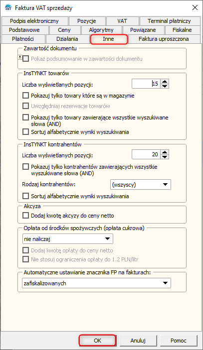 InsTYNKT to mechanizm wyszukiwania asortymentu i kontrahentów (w przypadku faktur sprzedaży) w bazie, pozwalający ograniczyć korzystanie z pełnych list dostępnych pod przyciskiem F2. Aby zmienić konfigurację dla faktur VAT sprzedaży, należy: