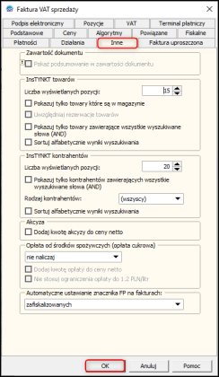 2. Na zakładce Inne, zmienić konfigurację na odpowiednią względem sposobu pracy i zatwierdzić OK. Opis każdego znacznika i skutku jego zaznaczenia jest dostępny po kliknięciu klawisza F1.