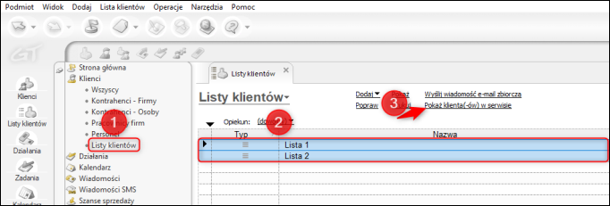 Gestor GT umożliwia wyświetlenie wszystkich klientów występujących na wybranych (zaznaczonych) listach klientów w celu wykonania dalszych operacji zbiorczych. Aby tego dokonać, należy przejść do modułu Klienci – Listy klientów i zaznaczyć wybrane listy klientów (jest to możliwe zarówno przez przeciągnięcie po listach lewym przyciskiem myszy, jak i wybierając pojedynczo z pomocą klawisza Ctrl). Po zaznaczeniu należy kliknąć przycisk Pokaż klienta(-ów) w serwisie. Spowoduje to przejście programu do modułu Klienci, w którym wyfiltrowani będą tylko kontrahenci znajdujący się na listach. Gestor zapobiega w tym wypadku powielającym się wystąpieniom.