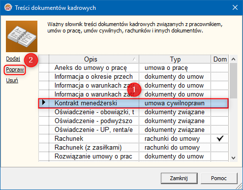 2. W oknie Treści dokumentów kadrowych zaznaczyć Kontrakt menedżerski i kliknąć opcję Popraw.