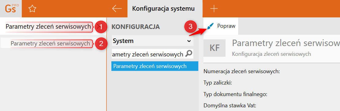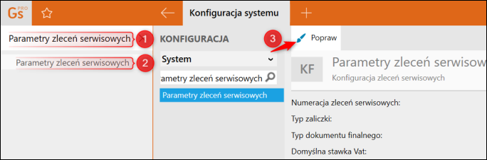 1. W lewym, górnym rogu programu, w wyszukiwarce wpisać Parametry zleceń serwisowych, wejść w wyszukany moduł i kliknąć górne menu Popraw.