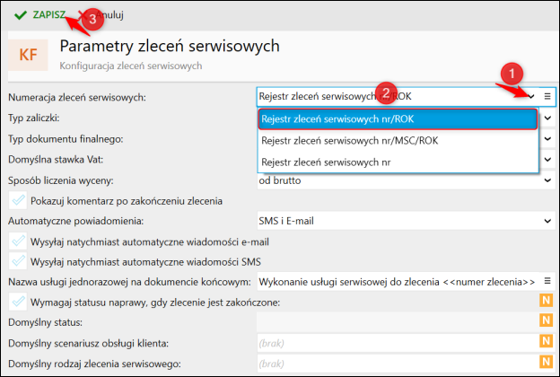 2. Z listy rozwijalnej Numeracja zleceń serwisowych wybrać odpowiednią numerację i zatwierdzić wybór przyciskiem Zapisz.