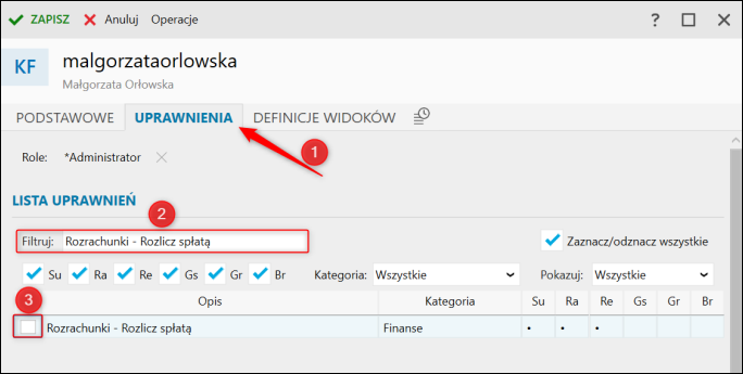 2. Przejść na zakładkę Uprawnienia, w Filtruj wpisać Rozrachunki - Rozlicz spłatą, a następnie odznaczyć znacznik przy wybranym uprawnieniu. Przycisk Zapisz zatwierdzi wprowadzone zmiany.