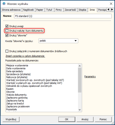 3. W oknie wzorca wydruku przejść na zakładkę Inne i zaznaczyć Drukuj walutę i kurs dokumentu.