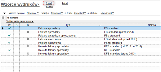 2. Na liście znaleźć wzorzec, który będzie edytowany (np. FS standard) i kliknąć Prawy Przycisk Myszy – Powiel lub wybrać Powiel z górnego menu.