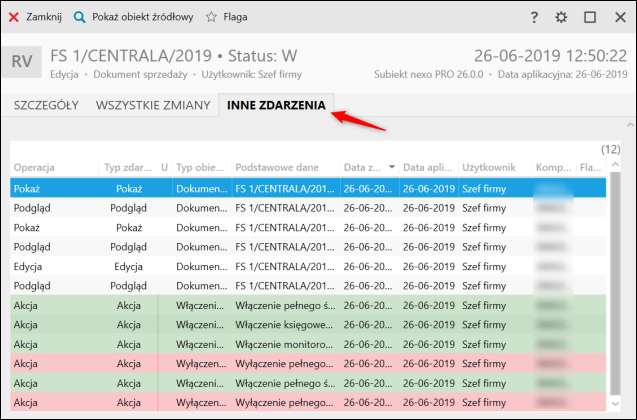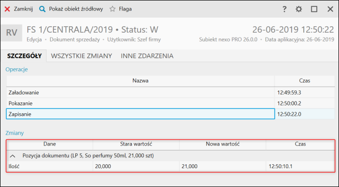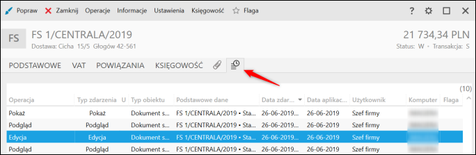 Aby sprawdzić informacje na temat danych zapisanych przez ślad rewizyjny, należy skorzystać z modułu Ślad rewizyjny lub dodatkowej zakładce widocznej na dokumencie.