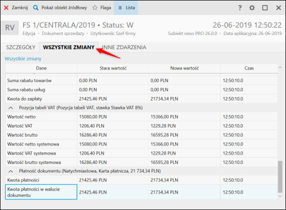 Zakładka Wszystkie zmiany pokazuje wszystkie zmiany i ich konsekwencje dla dokumentu.