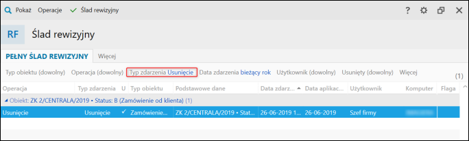 Ślad ​rewizyjny rejestruje także zdarzenia usunięcia dokumentów. Aby ułatwić wyszukiwanie takich zdarzeń, można posłużyć się filtrem Typ zdarzenia.