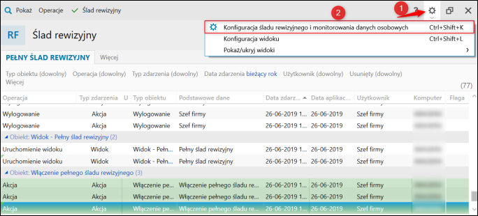 1. W module Ślad rewizyjny kliknąć „zębatkę" znajdującą się w prawym górnym rogu, a następnie wybrać Konfiguracja śladu rewizyjnego i monitorowania danych osobowych.