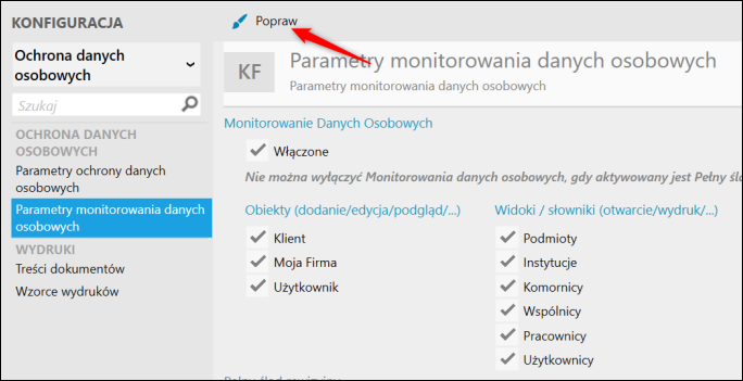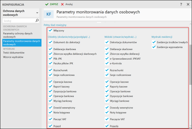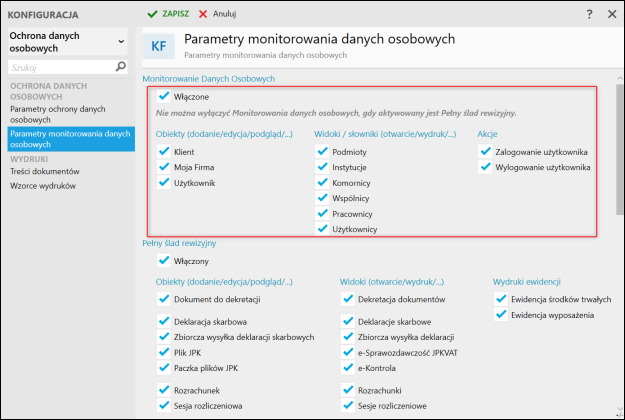 Uwaga! W przypadku aktywowanego Pełnego śladu rewizyjnego nie można wyłączyć Monitorowania danych osobowych.