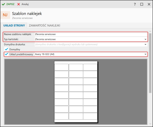 2. Wprowadzić nazwę szablonu i odpowiedni układ naklejek predefiniowany lub własny (aby wprowadzić własny, należy odznaczyć opcję Układ predefiniowany) w dolnej części okna. Dodatkowo jako Typ kartoteki należy ustawić Zlecenia serwisowe.