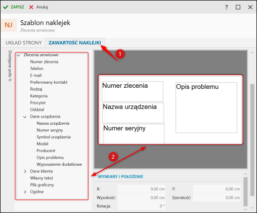3. Na zakładce Zawartość naklejki wprowadzić na szablon wybrane treści z sekcji Dostępne pola i zapisać.