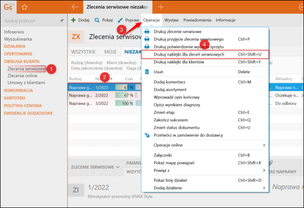 4. Przejść do modułu Zlecenia serwisowe, zaznaczyć wybrane zlecenie i z górnego menu wybrać Operacje  Drukuj ​ Drukuj naklejki dla zleceń serwisowych.