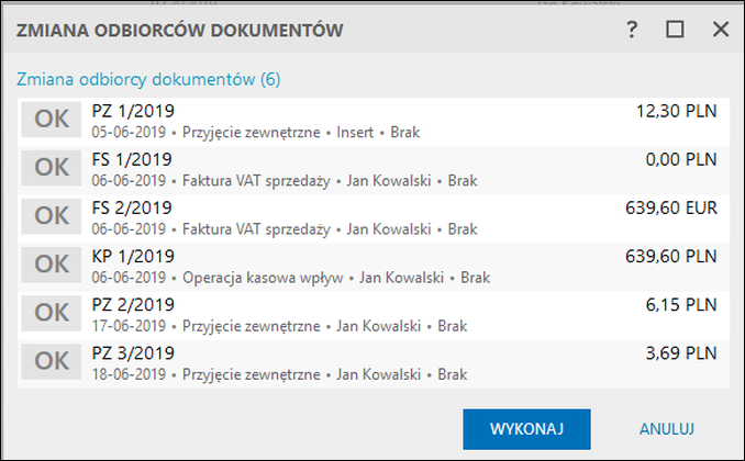 5. W oknie zmiana odbiorców dokumentów zatwierdzić wykonanie zmiany przyciskiem Wykonaj.