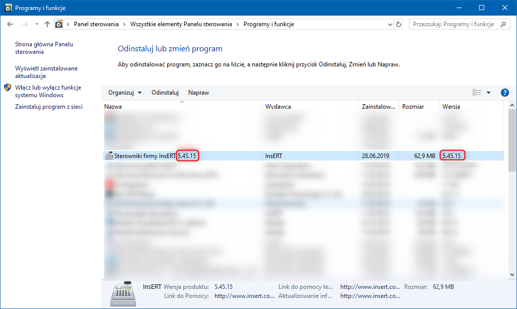2. Na liście zainstalowanych programów odszukać Sterowniki firmy InsERT. W nazwie oraz kolumnie Wersja będzie przedstawiona zainstalowana wersja. Aktualną wersję sterowników można pobrać ze strony internetowej firmy InsERT tutaj.