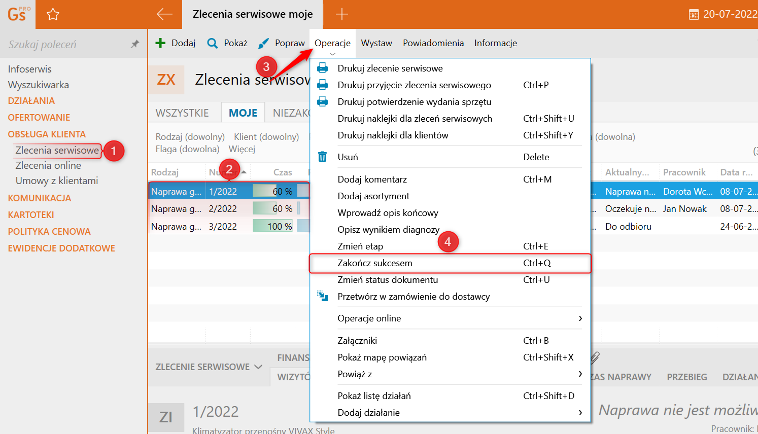​Zakończenie sukcesem powoduje zmianę postępu na 100% i etapu na ten, który został wskazany w scenariuszu obsługi klienta jako sukces. Aby zakończyć zlecenie sukcesem, można zarówno ustawić ręcznie dany etap na zakładce Przebieg, lub zaznaczyć wybrane zlecenie i z górnego modułu wybrać Operacje ​ Zakończ sukcesem.