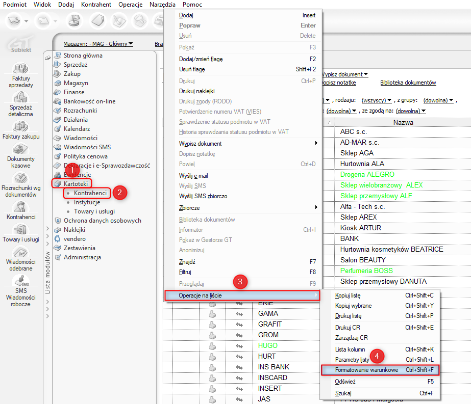 1. Z listy modułów wybrać Kartoteki – Kontrahenci, kliknąć listę Prawym Przyciskiem Myszy i wybrać Operacje na liście – Formatowanie warunkowe.