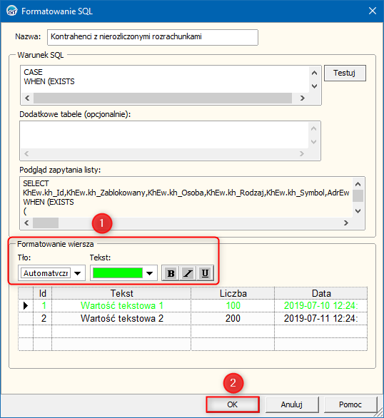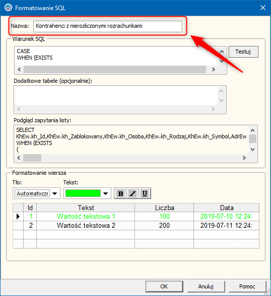 Za pomocą mechanizmu Formatowania warunkowego użytkownik jest w stanie wyróżnić część wyświetlanych wierszy poprzez zmianę koloru ich tekstu lub tła, ewentualnie pogrubienie, podkreślenie lub pochylenie prezentowanej w nich zawartości w dowolnym module, lub na dowolnej liście programu. Aby wyróżnić na liście kontrahentów tych, którzy mają nierozliczone i przeterminowane należności: