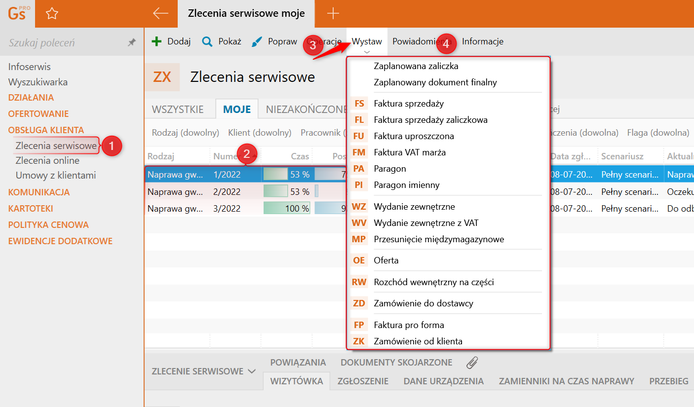 Dokument do zlecenia serwisowego można wystawić na dwa sposoby. Pierwszym z nich jest zaznaczenie danego zlecenia serwisowego w module Obsługa klienta – Zlecenia serwisowe, a następnie wybór z górnego menu Wystaw konkretnego typu dokumentu. Ponieważ menu jest również przyciskiem w oknie podglądu zlecenia serwisowego, drugim sposobem jest otworzenie zlecenia i skorzystanie z menu analogicznie pod przyciskiem Wystaw (opcja jest dostępna tylko na podglądzie, nie na edycji zlecenia). Oczywiście, aby wystawić dokument handlowy, wymagane jest, aby na podmiocie Gestora pracował również Subiekt nexo.
