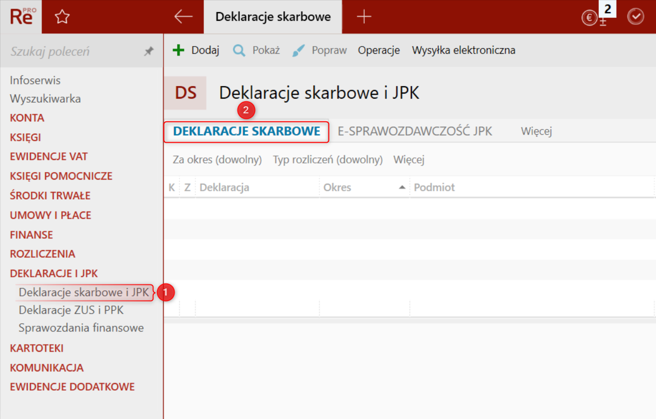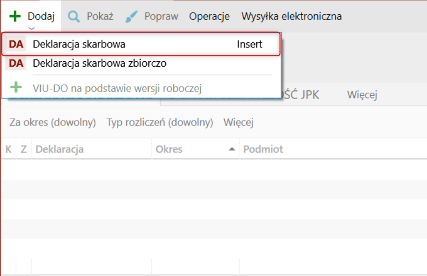 2. Z górnego menu wybrać opcję Dodaj – Deklaracja skarbowa.
