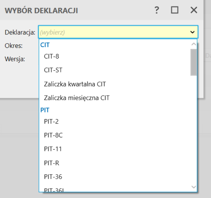 3. W nowym oknie wybrać rodzaj deklaracji z rozwijanej listy, a następnie wskazać okres i wersję deklaracji. W przypadku niektórych deklaracji wymagane jest również wskazanie osoby, dla której wystawiana jest deklaracja (program umożliwia tylko wybór osób, które spełniają odpowiednie warunki dla wystawienia danego typu deklaracji).